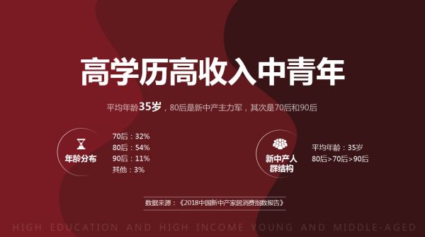 对于“新中产”一词,大家并不陌生,但这种“熟悉”仍停留于“名称”。这次数据发布,对新中产人群画像做了具象解读。中国新中产人群平均年龄35岁,他们在经济上取得了一定的独立,他们普遍接受过良好的教育,他们拥有归属感、安全感,并相信自己就是这个社会的中坚力量。