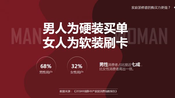 近年来,随着女性经济和社会地位的提高,“她经济”受到各行各业的追捧与关注,甚至有人说“得女人者得天下”,因此,在大众认知中,家庭装修理所当然“她做主”。但调查结果显示:在家庭装修中,男性消费者占比接近七成,比女性消费者高出一倍。