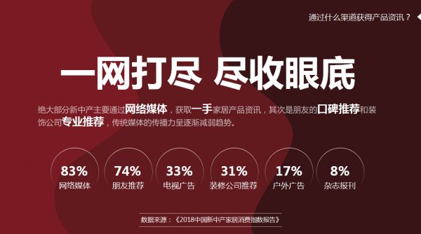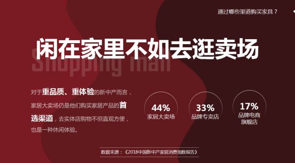 众所周知,家具属于典型的“低频次高单价”产品,虽然消费频次低,但单次消费总价却很高。也正因这样,消费者在做家具消费决策时,通常比较慎重,而对于重品质、重体验的新中产人群更是如此。作为互联网深度用户,新中产在购买家具时,首先通过网络媒体获取一手家居产品资讯,其次是朋友口碑推荐和装饰公司专业推荐,然后选择卖场作为线下主要体验渠道,最终综合多重因素做出决策。