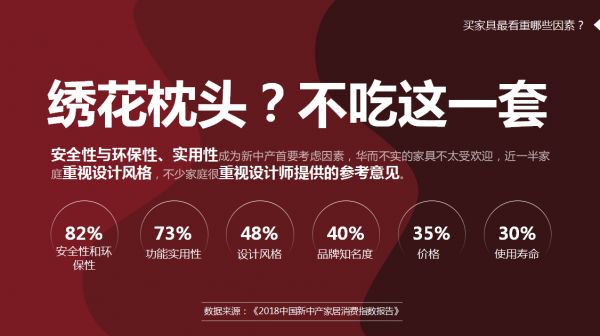 为进一步把稳生产制造方向,我们对新中产购买家具最看重的因素,也做了深入研究与数据分析。调查显示,安全性与环保性、实用性是当下新中产首要考虑的因素,华而不实的家具不太受欢迎。