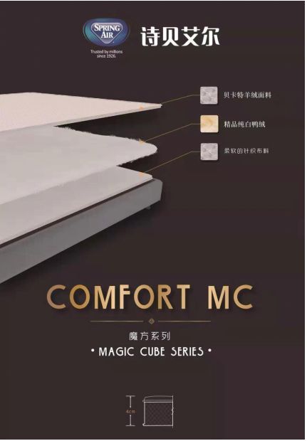 诗贝艾尔魔方系列Comfort 顶层为辅助式单体床垫,主体材料为100%白鸭绒,白鸭绒含量为2kg/平方,达到国家A类充绒量标准。同时沿用了该系列相同标准的贝卡特羊绒面料。采用手工拉花技术,在提升美观度的同时,有效避免跑绒情况的产生。另外隐形边角绷带的使用,使其能够完美的与该系列其它创带你相结合使用,同时又不会影响其单独使用时的睡感与外观。Comfort床垫配合Zone 5使用,在体现五区床垫腰、颈强烈支撑的同时,给予您柔软的贴合体验。能够有效的缓解失眠的睡眠障碍,非常适合平躺人群的使用。Comfort床垫配合Zone 5与Relax共同使用,基本集合了当下一张完美床垫所有的技术,其睡感标准就是来源于SA多年来特供五星级酒店套房级床垫的标准,因此您选择了整套魔方系列就相当于选择了五星酒店套房级的睡眠体验。