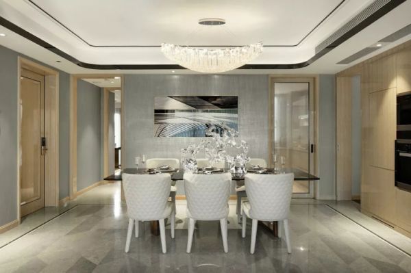 客餐厅内,设计师运用金属、大理石、皮包、玻璃等元素,有机地建立起一种高雅的生活格调,使现代元素更加活泼地展现出来。大容量的一体式高柜,不仅便于分门别类地存放物品,同时也不影响室内美观,有藏有露、更能体现空间层次感。