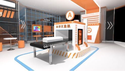 奥克斯“直卖风暴”巡展南京站的造型就别具匠心。入口处采用半透明材质面板,外部采用发光字,内部则用灯管进行点缀,令视觉效果更为通透、干净;左侧面使用半透明材质做墙体,辅以大量橙色元素做点缀,彰显青春活力;右侧面为卷帘门造型,波浪式的墙体更富有层次感,让镶嵌其中的橙色“AUX”更为醒目;背面是一个舞台区,在巡展期间,每天都会有多场互动活动。