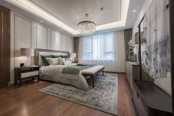 对称的布局,端庄大方的软装基础上,添上一把床尾凳,华灯下显得愈发的精致优雅。