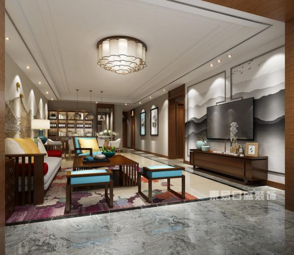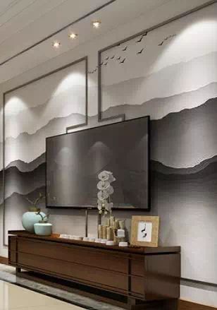 胡桃木色搭配自然的黛蓝色沙发和边几,搭配质感单椅,电视柜也选择了新中式风格的同款材质,地毯拼接形状。电视背景墙做了简单处理,使用了抽象水墨山水画壁纸,与沙发背景墙表面的沙粒质感相比,有异曲同工之妙,充满写意的意境。