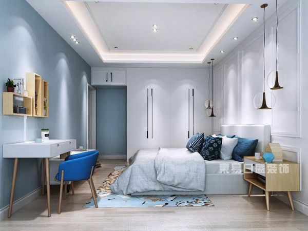 次卧的空间更具现代感一点,淡蓝色背景与原木的和谐相配,再加上大量的留白空间,极简灯饰与衣柜手柄的点缀,简约而不失雅致格调。