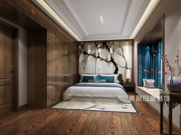 主卧大量深色的木纹运用,背景墙也用一副水墨画代替,让沉稳极富中式底蕴的空间多了份生机飘渺感。