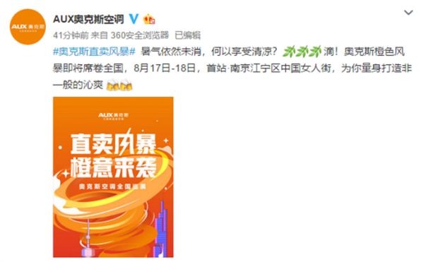 今日,奥克斯空调官方微博发布了一张主题为“直卖风暴 橙意来袭”的海报,为即将开启的“奥克斯空调直卖风暴快巡展”首站活动进行预热。