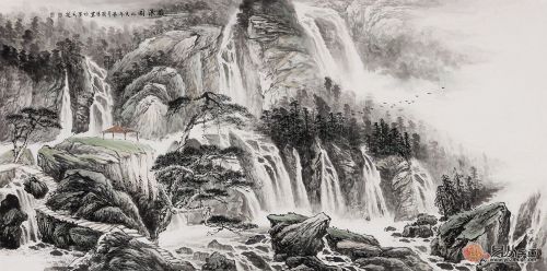 李国胜四尺横幅新品国画山水画作品《观瀑图》【作品来源:易从网】