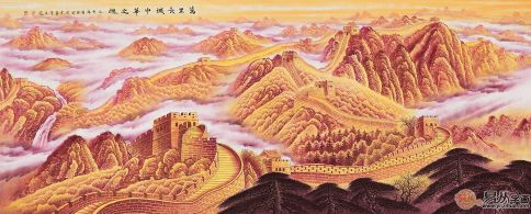 说道大气场客厅墙装饰画,不得不说的便是这幅万里长城国画了。李国胜老师的这幅步步高升《万里长城中华之魂》作品,画家以纵横的笔墨,将那连绵起伏的山峦尽显笔端。山峦之上玉树叠翠,郁郁苍苍。而其间如龙盘虎踞般的长城,蜿蜒回旋。时隐时现在群山与云雾之间的长城,更是披上了一层神秘的面纱,金色设色,更显瑰丽雄伟。挂在客厅既可以衬托出主人家的富贵荣华,还能增加客厅的大气场,对家人运势也很好。