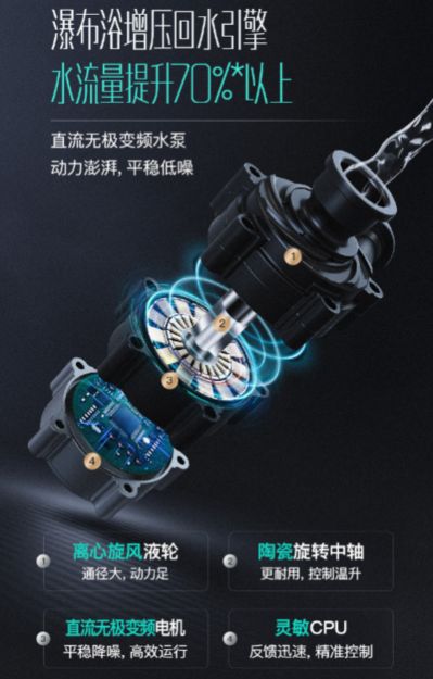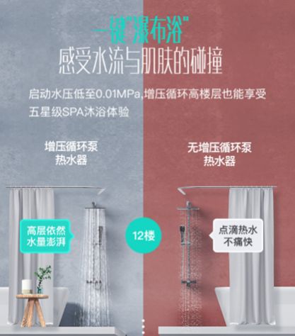对此华帝从水压和水泵性能双管齐下,首先通过0.01MPa的低水压启动技术,让高楼层使用不在话下;其次采用瀑布浴增压回水引擎科技,改善了直流无极变频水泵的性能:离心旋风液轮、陶瓷旋转中轴、无极变频电机和高灵敏的CPU精准控制,动力澎湃,平稳低噪,大大提升了出水动力,流水量比常规提升70%以上,让用户可以尽享海量舒适热水。