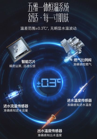 其他关键硬件方面,这款产品采取升级版的专利恒温仓,容量增加80%以上,是恒温效果,也是瀑布浴和零冷水效果的更要保障之一;同时,产品标配燃气比例阀、进水流量传感器、进水、出水温度传感器,以及智能芯片精密运算,形成五维一体的恒温控制系统,温差范围在0.3摄氏度之内,几乎无明显水温波动,可以称之为真恒温的标准。