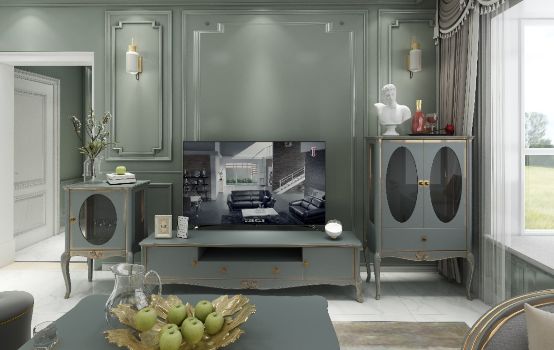 把握整间屋子的风格基调,从墙面到家具甚至装饰品,让整个空间相对统一,电视墙反而不用刻意修饰。太子家居洛曼系列只使用了湖绿色的温厚墙面搭配欧式石膏线,便让空间更有层次感,背景墙简单明了,用复古壁灯和电视柜整体搭配充分,体现出洛可可风。