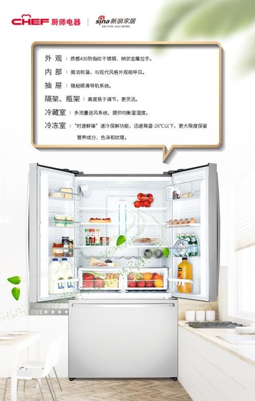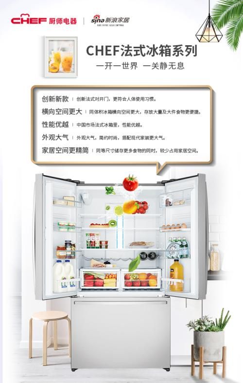 CHEF法式冰箱系列顺应时代设计潮流,创新法式对开门设计,不仅更加符合人体工程学,也使得冰箱横向空间更大,不论是日常的瓜果蔬菜还是小朋友的雪糕饮料大件蛋糕,都能大小兼顾收纳其中。
