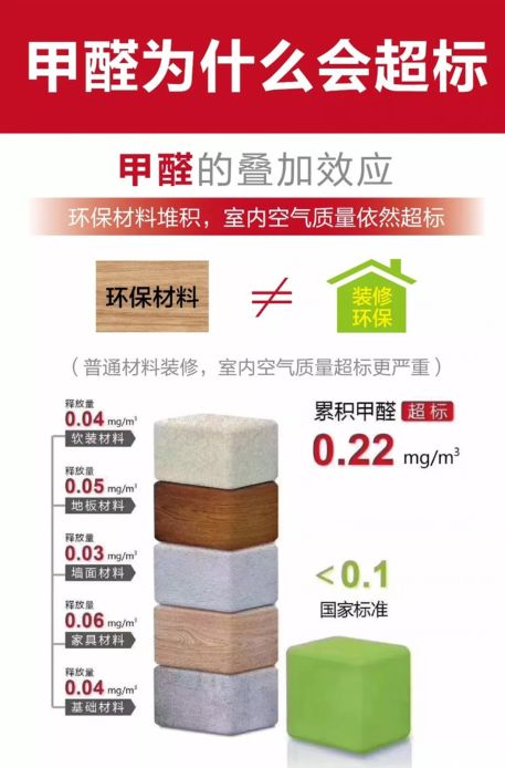 这个要归结于装修叠加原理。环保材料装修不等于无毒装修,虽然单个装修材料的甲醛含量很低,但所有装环保装修材料一起装修使用,累积会导致室内甲醛总释放量超标。