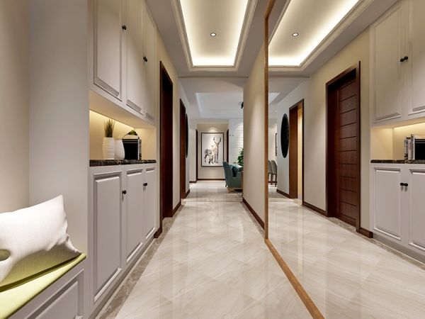过道选择白色作为主色调,加以少量灰色作为点缀,墙壁上添加落地窗增加空间感,使用大线条柜来展现风格的简约与大气。