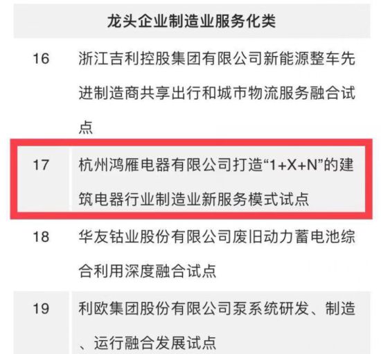 浙江省第一批现代服务业与先进制造业深度融合试点名单近日公布,鸿雁电器打造“1+X+N”的建筑电器行业制造业新服务模式项目成功入选。