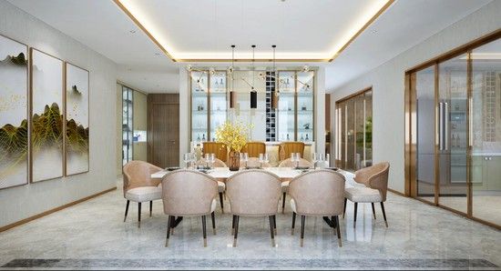 岁月金檀与高光亚克力的相衬,尊贵与浪漫完美结合,脑海不知觉浮现华丽的华尔兹场面,在这样的一个餐厅空间弥漫着内贵张扬的超凡气度。酒柜玻璃掩门设计干净地将品味都呈现在眼前。