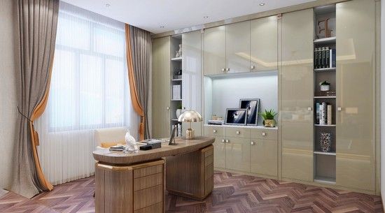 在中世纪的欧洲,早已有艺术品表达对智慧、真理与知识的追求,拉斐尔的《雅典书院》便是其中的一幅,现代家居中设计一个怀古情怀的书房空间,便可感受欧式场景与人的书香气息和学术氛围。安格尔系列书房置于主卧中,设计在窗旁,光线充足。柜体都贴合空间设计,半开放式多功能区结合,让学习和办公都简单化。