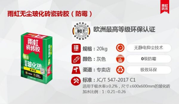 雨虹“无尘”系列瓷砖胶严格执行国家及行业标准,且通过EC1plus欧洲最高等级环保认证,产品贴砖性能优异、环保性能更加强大、零甲醛、高环保,为您带来真正安全、洁净的工作环境。
