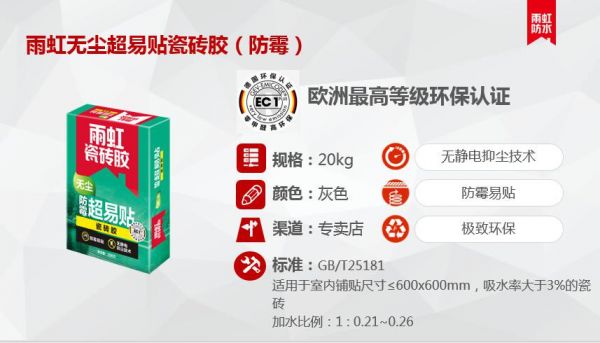 目前,在中国建材零售市场上,各种各样的瓷砖胶使得工人工长和消费者难以抉择。相信雨虹“无尘”系列瓷砖胶的问世,可以为市场带来真正高体验、高性价比的产品,让大家选择更放心,使用更安全、更舒心。