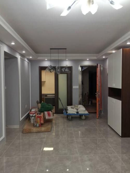 从最初的设计到装修完工后总用时32天,完工后的客厅如图,米色大理石墙面橱面搭配烟灰色瓷砖地面和橱柜,显得整个空间变得更加立体通透,橱柜悬空大大地增加了收纳空间,整洁大方的外观使其自然地融入整体。瓷砖质感的墙壁非常容易打扫清洁,更显整齐,创意优雅的吊灯让客厅有一种独特的味道。