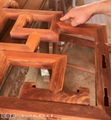 其次,榫卯结构。只有将开好的木料做出榫卯,才能有精密科学的结构、更加坚固牢实。榫卯结构将木料物性与人的巧思匠心完美地融合在一起,追求天人合一的境界, 形成了家具整体的和谐之美。经过开榫凿眼、起线打圆以及认榫的步骤后,流溢着书画笔墨之意的榫卯过程便告结束。