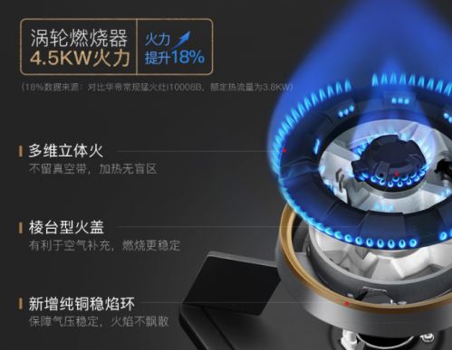 对于炉头火焰,一些厨具制造商也在创新改进,以燃烧技术研究见长的华帝厨电就在环形莲花炉头的基础上,研究出先进的涡轮燃烧器,创新的燃烧机产生出多维立体火焰,使炉头在里外燃烧环的真空地带也有火焰产生,让加热没有盲区。涡轮燃烧器产生的火焰角度,也从传统的垂直方向,变为向外倾斜约30度,这样,火焰覆盖的锅具面积更大,让锅具受热更加均匀,达到更好的烹饪效果。