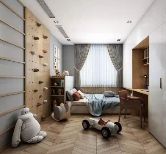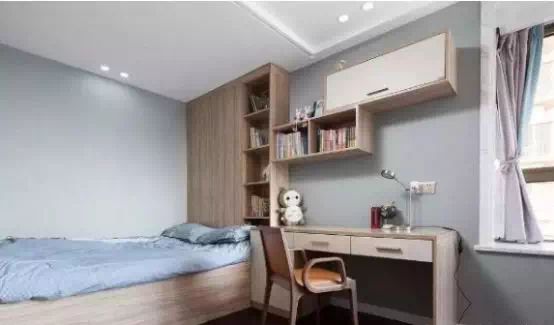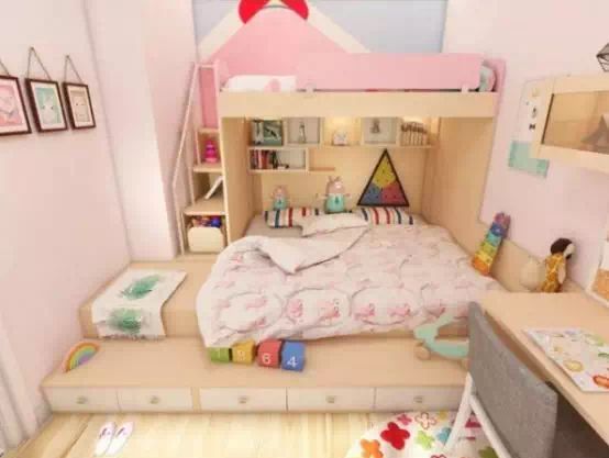 把儿童床做成榻榻米床+书桌的组合形式,位置靠窗比较好,这样看书学习的时候光线更好。墙面同样可以刷成孩子喜欢的颜色,铺贴他们喜欢的壁纸、壁画等。