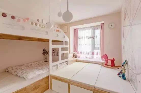 这间儿童房的格局思维比较创意,把榻榻米、飘窗与上下铺巧妙地结合在一起,让小空间也显得实用宽敞,同时榻榻米还提供了一个童趣的活动空间。两孩的家庭装这种儿童房最合适,喜欢打滚的孩子有了场地,方便了父母照看孩子,超多的玩具也有了容身之处。