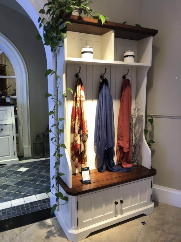 这款集柜子、椅子、衣架等多种功能为一体的衣帽架十分实用,放置于玄关处,除了可以随手将换下来的外套、帽子、包包挂在上面,还可以作为换鞋凳使用,长凳下方双开门柜子的设计,为储物提供了充足的空间,上方的搁板上可以放置储物箱,让玄关处整齐有序。