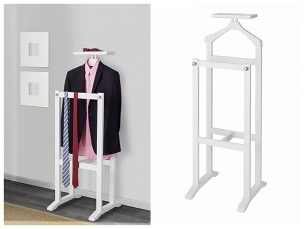 这款衣帽架的收纳功能并不强大,但将衣撑融入整个衣帽架的设计可谓独具匠心。适用于收纳要求比较高的西服、羊毛大衣等衣物。衣撑上方连接一个小的储物台可以放置一些小物件,前面方方正正的框架结构上也可以放置领带、西裤等。