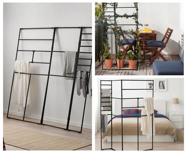 这款衣帽架看起来只是简单的框架结构,其实它有多种使用方式,可以将它展开靠在墙上,简单的挂一些衣物,也可以将它折叠起来,随意置于一处,既可做房间的隔断,也可作为衣帽架使用,还可以在上面装饰一些藤蔓植物,使它成为家中的一处小风景。