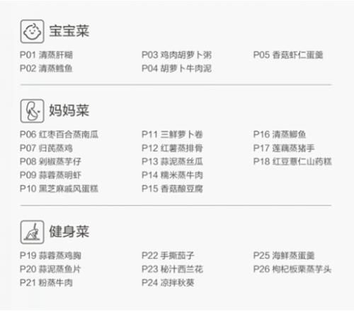 宝宝的健康需要关注,妈妈也同样需要呵护。尤其是对于产后,处于哺乳期的职场妈妈而言,营养的摄入显得尤为重要。老板蒸箱ST01搭载的26道营养菜谱中,包括13道适合职场妈妈们的“妈妈菜”。这些菜品或营养丰富,或补气生血,或低脂健康,不仅适用于妈妈,也适合与家人共同享用。