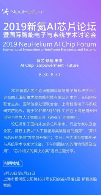 2019新氦AI芯片论坛暨国际智能电子与系统学术讨论会由上海新氦类脑智能科技有限公司主办,国际信息处理联合会、上海智能电子与系统研究院协办,将于2019年8月30日-8月31日在上海杨浦长阳创谷召开。对于本次论坛的具体议程及报名方式请扫描下方二维码,关注新氦类脑智能公众号。