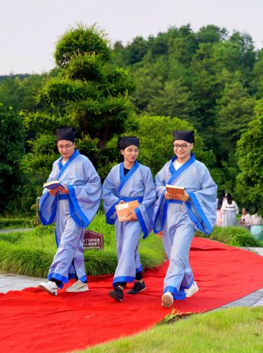 下午5时许,伴着落日余晖,身着特色古装的公司全体成员在绿草如茵的草坪上开始了红毯走秀活动。大家两人一对,三人一组,各自演绎着古装塑造的角色。男士有青衣加身的正统书院学生捧书而行,有武林侠风的侠客缚剑而来,也不乏有自带喜感的“花花公子”手持折扇踉踉跄跄;女士则更多是霓裳羽衣款款徐行,有“小家碧玉”、“大家闺秀”,也有“国民淑女”等等,风格迥异的古装扮相引得现场观众赞叹不已。