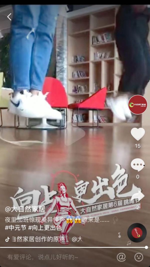 在大自然家居总部大楼,更是有员工自发组织玩起抖音小视频拍摄,通过趣味搞笑的情景剧情,演绎出别具一格“向上更出色”的主题精神,以年轻人独有的方式呼吁用户参与到全民跳绳运动中,不管生活如何艰辛,都要积极向上,拥抱生活,做更出色的自己。