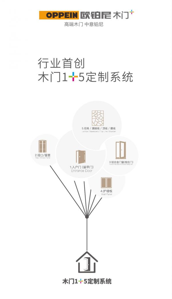 欧派家居的欧铂尼木门通过对4.5W+家庭深入调研,划分八大人群进行系统分析,深入探讨消费者的购买方式及生活习惯,发现消费者对木门产品的设计需求,最终该方案的理念定位中高端人群,致力于提供定制木门的系统解决方案。“1”代表:全屋木门。“5”代表:A入户门;B垭口、窗套;C铝合金门窗(推拉门);D护墙板;E花格、踢脚线、顶线。