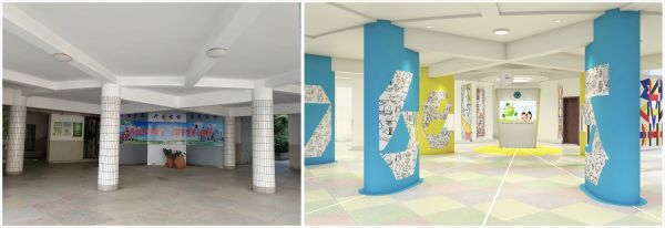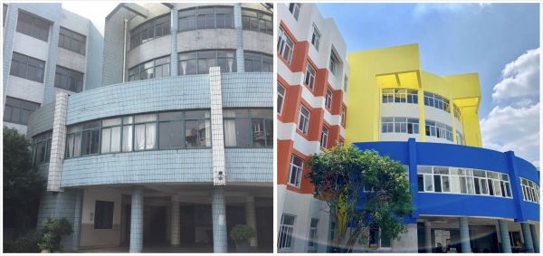 目前,改造项目已在多方关注下顺利进行,外立面已刷新完毕,计划于2019年8月底完成所有工程并投入使用。此次校园改造由拥爱设计公益计划理事梁靖团队操刀,通过缤纷色彩及创意功能设计,为校园注入更多活力。