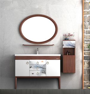 安华卫浴山影系列N1M11G03-B,设计来源于《徐霞客游记·游黄山日记》中“西望碧痕一缕,余疑山影,僧谓:山影夜望甚近,此当是云气”诗句。柜体颜色采用白色与红木色的搭配,主柜山水画采用UV打印技术,色彩绚丽展现无限的新中式感;拉手设计采用青铜色锌合金拉手,简约时尚造型设计彰显新中式的年轻时尚。