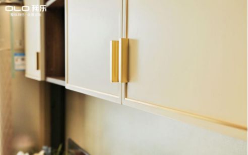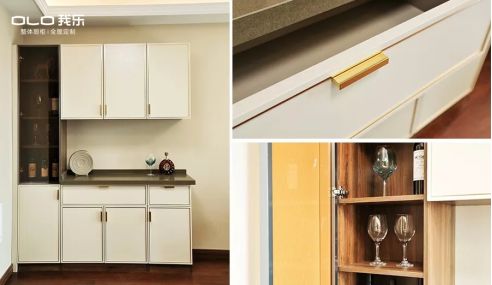 客户的客餐厅选用的是我乐现代轻奢风柏悦系列,打开门就可以看到,由浅色门板与奢华的镶金描边相结合的客餐厅,质感与大气并存,柜体上的金色竖型拉手,更是将主人的高端品位展现得淋漓尽致。
