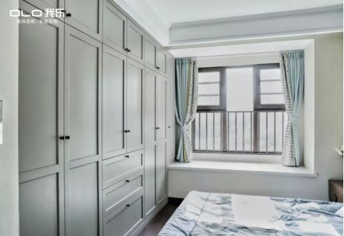 功能性设计上,我乐设计师不仅紧贴卧室的一整面墙制作了超大面积的整体衣柜,还巧妙地利用飘窗台一侧的空间,制作了一组矮柜,将卧室的功能最大化,再多的衣服也能放下!