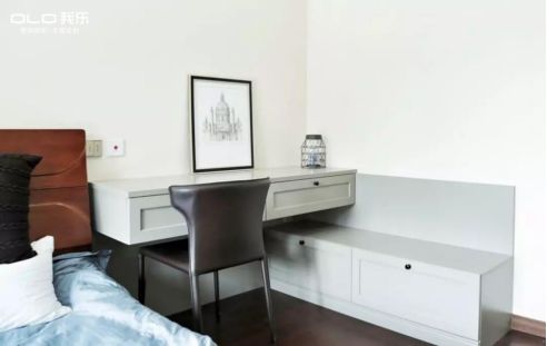 另外,卧室内设计师没有给客户选择传统的床头柜,而是在角落里设计了一组整体书桌,既可以做梳妆台也可以做工作台,一桌多用,十分方便。