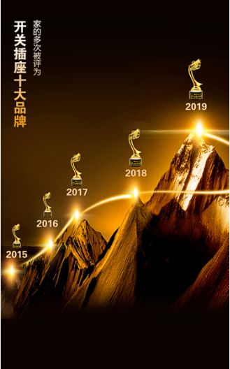 2015年~2019年,家的开关屡次被评为“开关插座十大品牌”。该荣誉,由十大品牌网颁发。十大品牌网,是品牌领域专业程度高、访问量连续多年领跑行业的网站,是CNPP官方授权查询网站。CNPP基础数据一律来源于国家相关部门、品牌评价机构、统计资料、市场调查数据、媒体互联网、网友点击投票等。
