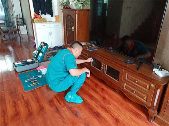 紧接着,工作人员又继续检查衣柜和电视柜的问题,发现是因为紧固螺丝松动,导致门板和抽屉面板歪斜。维修师傅随即对此进行了加固和调整,并向马女士介绍了家居保养的小常识。