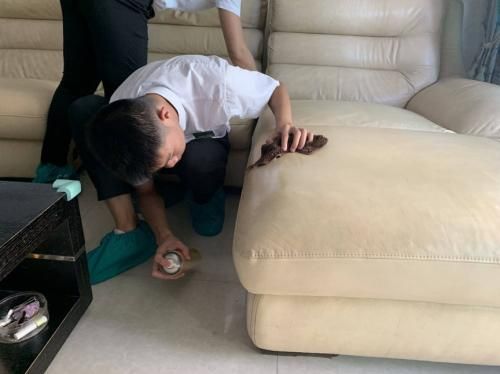 专卖店的工作人员来到马女士家中,看到有污渍的沙发,维修师傅拿出全屋美颜工具箱中的专用家居清洗剂,对污渍进行反复擦拭,再用毛巾折成小条,把沙发缝隙的脏污杂物都清理干净,接着,维修师傅用抛光蜡擦拭沙发皮面,用抛光盘进行了抛光,最终让沙发洁净如新。