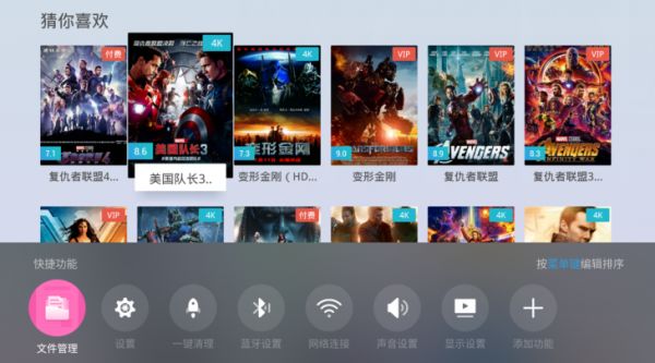 当贝超级盒子B1搭载当贝OS 2.0。界面简洁清新,运行速度快人一步,操作不卡顿。一眼过去各版块分明,没有诸多烦人的内置软件,轻装上阵。更为重要的是整个页面都是可以根据自己喜好进行自定义调整的:不论是顶部的常用应用还是底下的各分类版块,都可以自由选择去留,十分适合家中不同成员。老人孩子可以通过使用人工智能AI语音遥控功能,轻松上手使用。