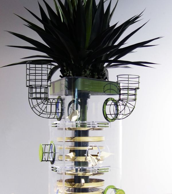 是为动植物构建的乌托邦式的“绿之塔”,通过垂直叠加并间隔放置,使圆形电影胶片盒被透明回收亚克力构件所围合,并赋予其野外鸟窝、食盘和猫舍的功能。同时,塔端道具绿植及其承托盘,可将过滤后的雨水沿中心管道束下落至塔底集水器,以供动物饮啜。