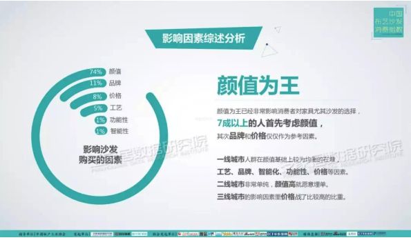 沙发也要“颜值为王”。 2019中国布艺沙发消费指数调研结果显示,7成以上的消费者看颜值,但也有7成以上消费者对当市产品颜值不满意,这明确表达了当下的主流消费意识。换言之,颜值模块提前布局的品牌具有先发优势。斯可馨沙发董事长胡卫东2年前提炼出“美是家的信仰”slogan后,曾接受记者访谈时回顾:之所以在群雄林立的沙发阵营中脱颖而出,关键在于企业一直以来对于产品美感的追求与坚持,也是企业深化以美为尊的文化内涵的结果。