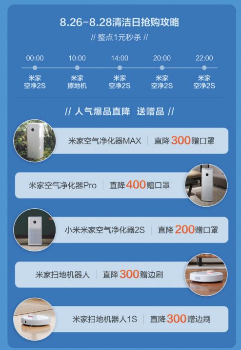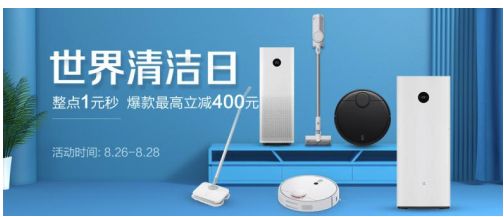 米家MIJIA“世界清洁日”专场8月26-28日火热来袭,活动优惠空前,包括爆款整点1元秒杀、预售定金7倍膨胀、抽奖赢千元扫地机等,更多优惠在小米有品清洁专场等着你。